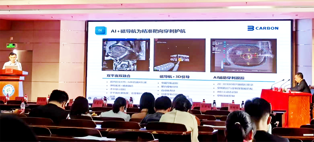 会议期间,南方医科大学第三附属医院杨诚教授以《多模态融合影像在前列腺活检穿刺术中的应用》为分享主题,从前列腺穿刺的特点、发展等方面回顾了前列腺穿刺方式和理念的变迁。并结合临床手术案例,详细讲解了卡本VENUS的多模态影像融合、AI器官分割、3D器官重建、弹性配准、自动化布针、电磁导航,精准靶向穿刺等技术在经会阴前列腺穿刺活检中的优势,精准高效,且学习曲线短。